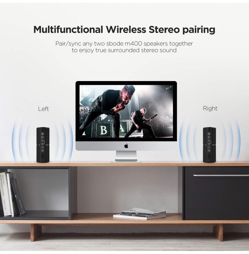 Sbode M400 Speakers providing 8 hours playing time and only takes 3 hours to be fully recharged. Its rubberized housing and IPX6 rating make it a great option for trips to the beach, singing in the shower, or basically